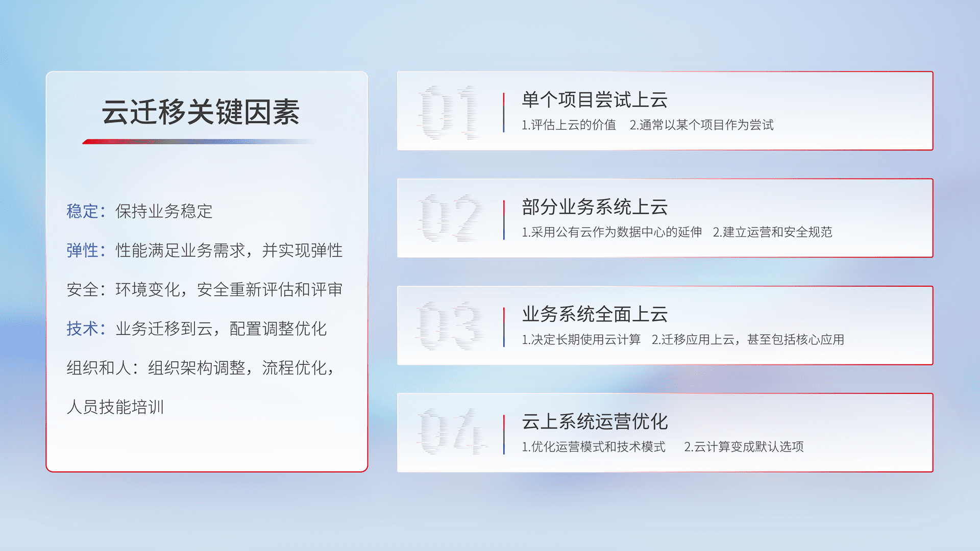 结合实际业务,,,,从规划设计、、云平台选型、、云原生改造、、数据迁移、、集成交付,,,,迁移全过程为客户识别最佳上云路径,,,做好风险识别管理,,设计网络架构、、身份权限、、安全审计合规、、、、操作审计、、、、日志审计、、、监控告警策略、、多站点容灾设计等,,,,对云上基础设施进行整体规划,,提升IT治理水平,,,,以满足弹性、、、、高可用、、高性能的需求。。。。