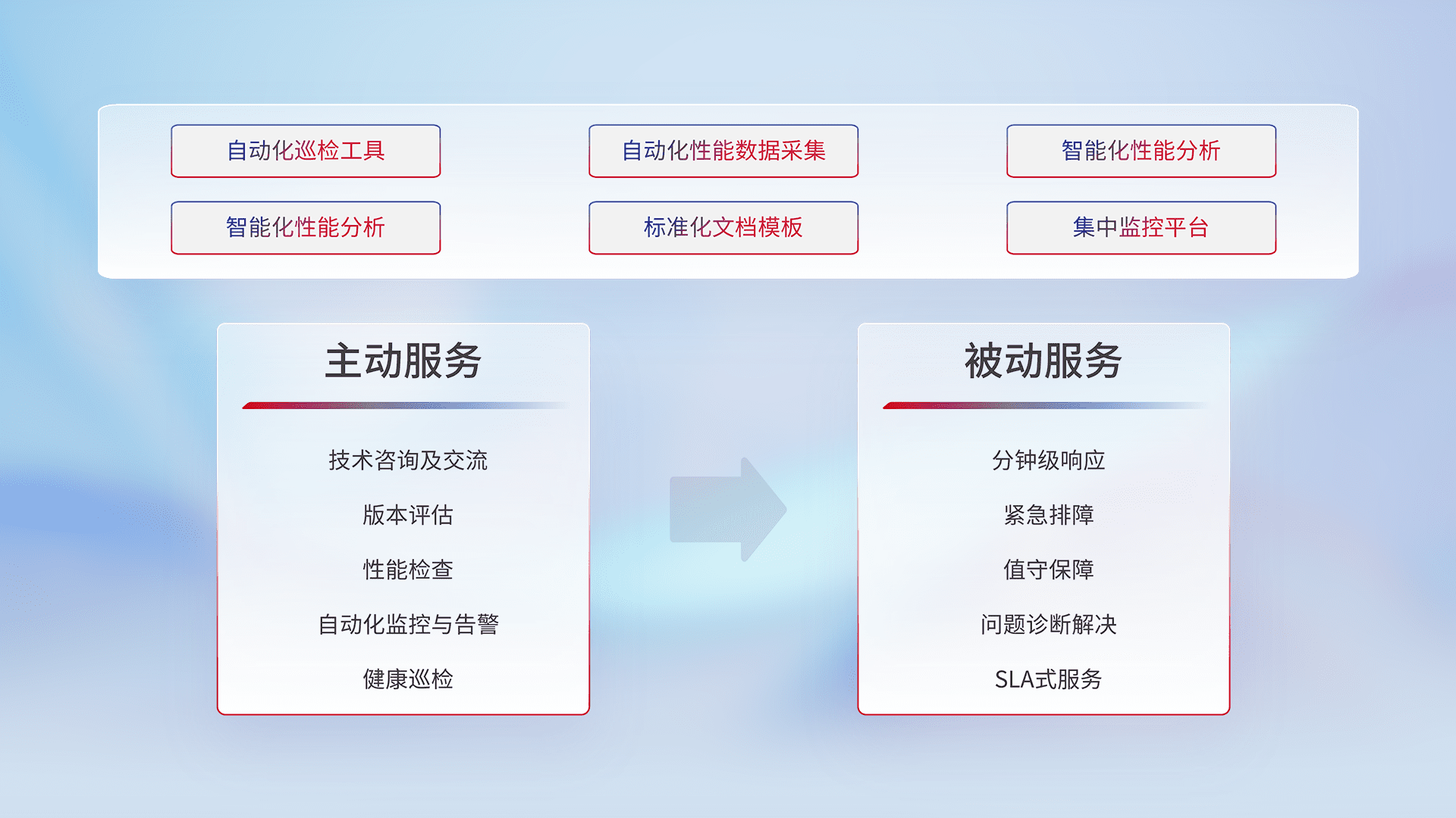 智能化工具和标准化文档,,保障服务质量,,提供主动服务(包含技术咨询、、、、版本评估、、、、性能检查、、、自动化监控与告警、、健康巡检)和被动服务包含(分钟级响应、、紧急排障、、值守保障、、、问题诊断解决、、、、SLA服务)。。